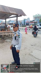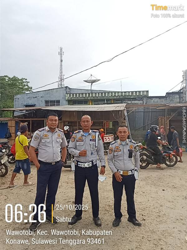 Konawe – Personel Dinas Perhubungan (Dishub) Kabupaten Konawe menunjukkan dedikasi tinggi dengan tetap bertugas mengamankan arus lalu lintas di depan Pasar Wawotobi, meskipun bertepatan dengan hari libur, Sabtu (25/10/2025).