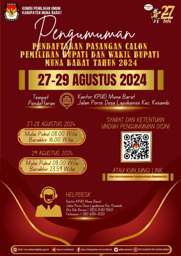 Mubar, Komisi Pemilihan Umum (KPU) Kabupaten Muna Barat (Mubar) resmi mengumumkan dimulainya pendaftaran bagi pasangan…